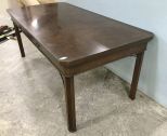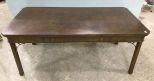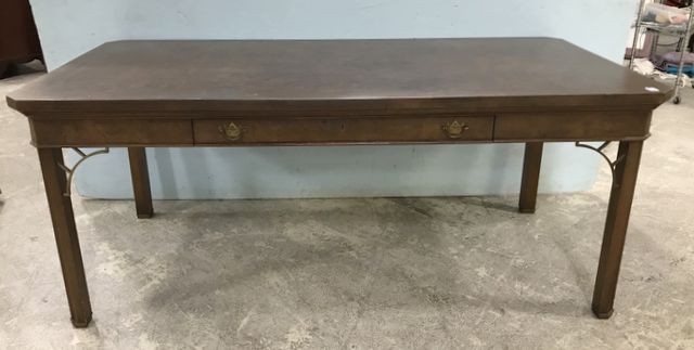 Large Chippendale Style Writing Desk, single drawer, burl mahogany finish, inlaid top, has wear, rectangle, 30"h., 72"w., 36"d. Large Chippendale Style Writing Desk, single drawer, burl mahogany finish, inlaid top, has wear, rectangle, 30"h., 72"w., 36"d.