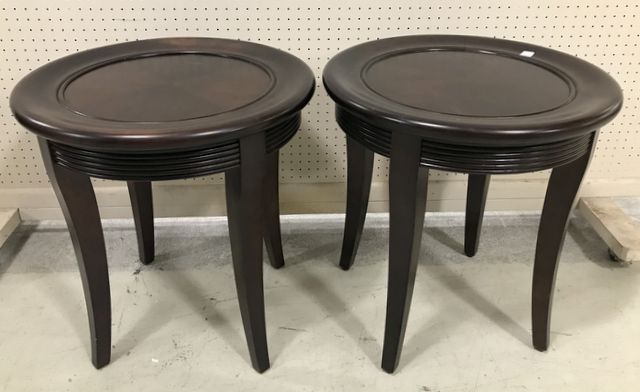 Pair of Modern Round Top End Tables, dark wood finish, has minor finish wear, 24"h., 23"dia. Pair of Modern Round Top End Tables, dark wood finish, has minor finish wear, 24"h., 23"dia.