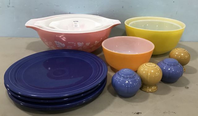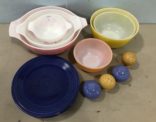Pyrex and Fire King Cook Ware Bowls, three Pyrex assorted sized bowls, Fire King yellow bowls, and salt & pepper shakers, 4 stoneware plates. Pyrex and Fire King Cook Ware Bowls, three Pyrex assorted sized bowls, Fire King yellow bowls, and salt & pepper shakers, 4 stoneware plates.