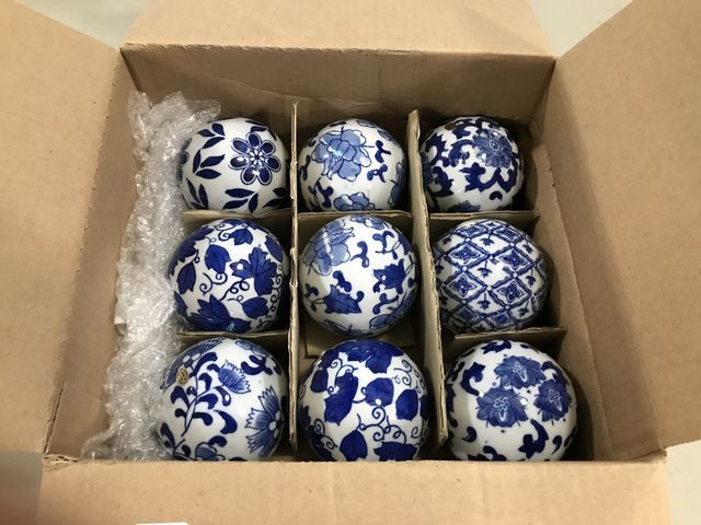 Nine Blue & White Decorative Balls, made in China, 9 total. Nine Blue & White Decorative Balls, made in China, 9 total.