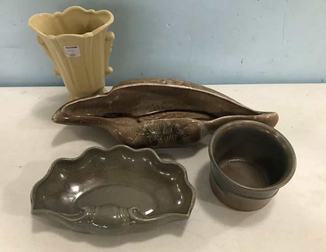 Redwing pottery dish, McCoy style urn vase 8"h., Glayds pottery dish, Sells pottery bowl. Redwing pottery dish, McCoy style urn vase 8"h., Glayds pottery dish, Sells pottery bowl.