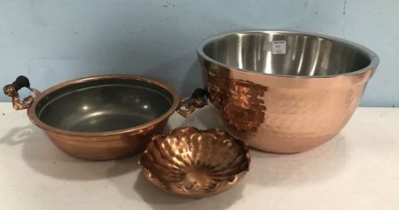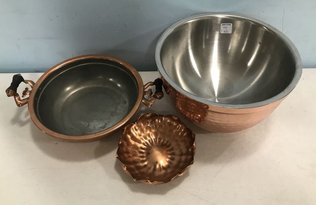 Hammered design copper serving bowl 6"h., 11"dia., signed copper dish, copper handled bowl, New York. Hammered design copper serving bowl 6"h., 11"dia., signed copper dish, copper handled bowl, New York.