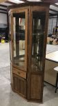 Large 1980's-90's One Piece Corner Cabinet, mirrored back, glass shelves, single drawer, single door storage bottom, oak finish, beveled glass side panels, front door is plexiglass panel, lighted, 85"h., 43"w., 21"d. Large 1980's-90's One Piece Corner Cabinet, mirrored back, glass shelves, single drawer, single door storage bottom, oak finish, beveled glass side panels, front door is plexiglass panel, lighted, 85"h., 43"w., 21"d.