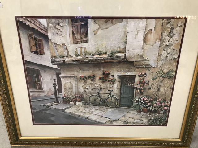 Large Gold Gilt Framed Wall Print, street scene, matted, glassed, 38"h., 44"w. Large Gold Gilt Framed Wall Print, street scene, matted, glassed, 38"h., 44"w.