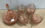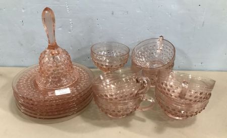 Group of Pink Hobnail Glassware, 6 saucers, 6 cups, goblet, bell. Group of Pink Hobnail Glassware, 6 saucers, 6 cups, goblet, bell.
