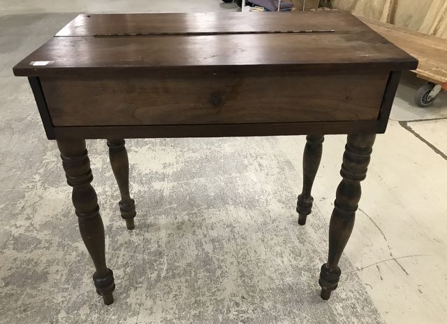 Small Lift Top Writing Desk, slide out writing board, cubby storage, two legs have been glued, 32"h., 32"w., 18"d. Small Lift Top Writing Desk, slide out writing board, cubby storage, two legs have been glued, 32"h., 32"w., 18"d.