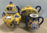 Three Hands Company Oriental Style Pottery, orange and blue urns, pitcher, missing lids. Three Hands Company Oriental Style Pottery, orange and blue urns, pitcher, missing lids.