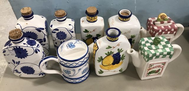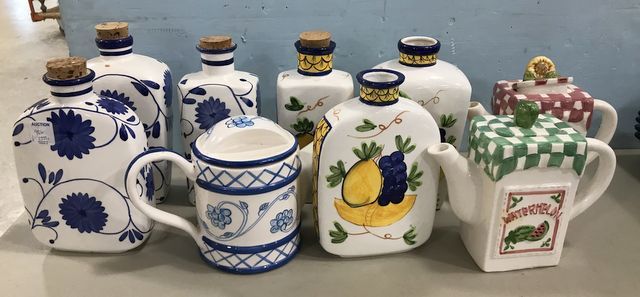Group of hand painted blue and white spice containers, and ceramic pitchers. Group of hand painted blue and white spice containers, and ceramic pitchers.