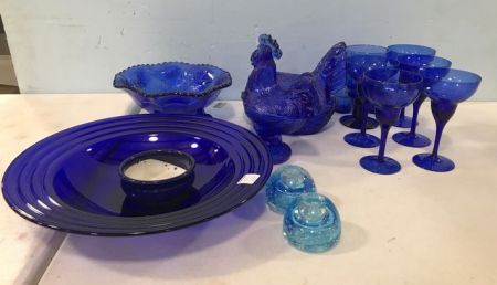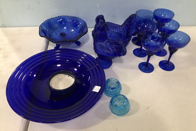 Large blue serving bowl, Deer pattern blue footed bowl, blue chicken and rooster candy jars, glass candle holders, five blue stems, and glass. Large blue serving bowl, Deer pattern blue footed bowl, blue chicken and rooster candy jars, glass candle holders, five blue stems, and glass.