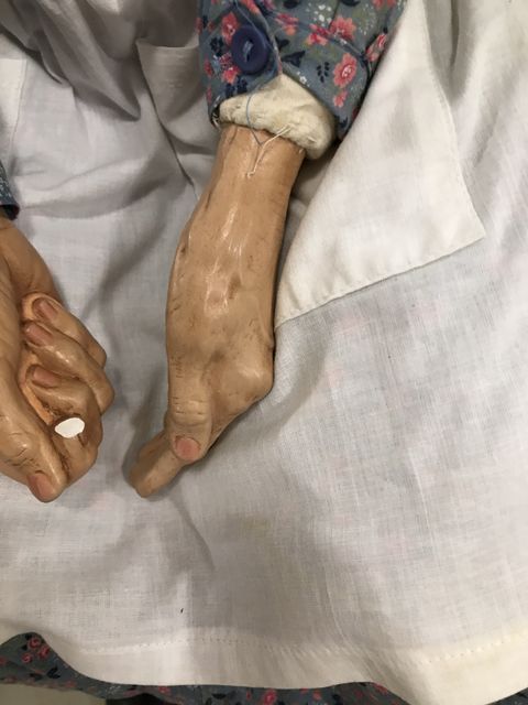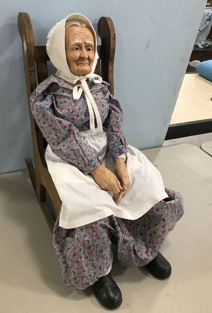 Realistic Ceramic hand painted granny figurine, clothes, wood rocker chair, missing tip on one finger, 23"h. Realistic Ceramic hand painted granny figurine, clothes, wood rocker chair, missing tip on one finger, 23"h.
