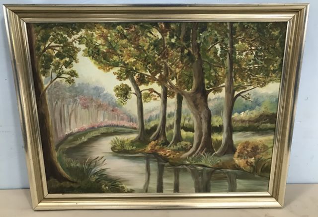 River Landscape Painting by Thelma Triche, oil painting on canvas, framed, 20"h., 27"w. River Landscape Painting by Thelma Triche, oil painting on canvas, framed, 20"h., 27"w.