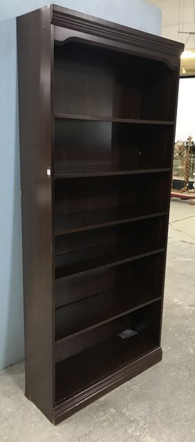 Pressed Wood Modern Bookcase, illuminated wood finish, five shelves, some wear, 84"h., 36"w., 18"d. Pressed Wood Modern Bookcase, illuminated wood finish, five shelves, some wear, 84"h., 36"w., 18"d.