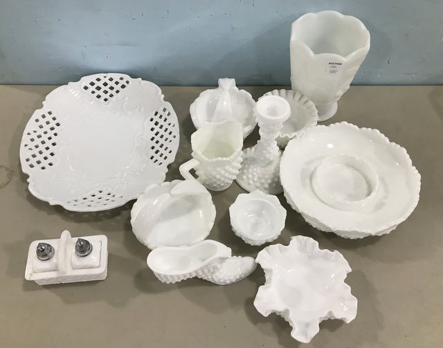 Group of Milk glass vases, dishes, shoe, candle holder, salt pepper, pitcher, basket, platter. Group of Milk glass vases, dishes, shoe, candle holder, salt pepper, pitcher, basket, platter.