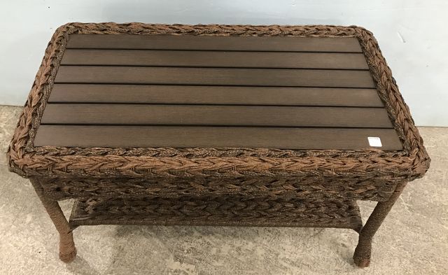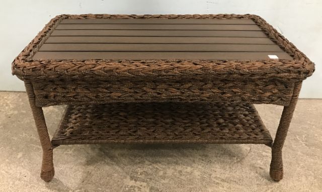 Modern Two Tier Coffee Table, wood top, woven sides, 18"h., 34"w. Modern Two Tier Coffee Table, wood top, woven sides, 18"h., 34"w.