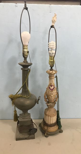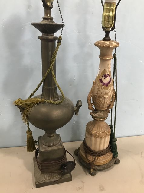 Urn bronzed color lamp and porcelain hand painted lamp, has damage, no shades, 34"h. Urn bronzed color lamp and porcelain hand painted lamp, has damage, no shades, 34"h.