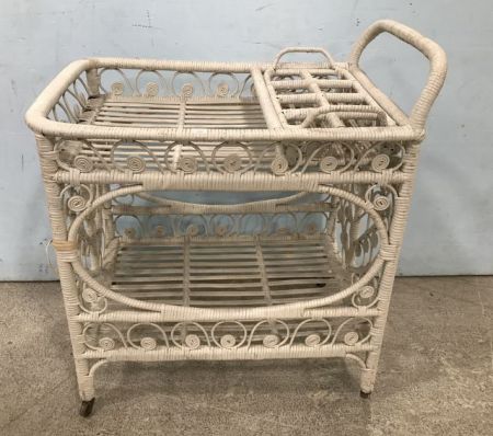 White wicker serving cart, two tier, cups holding slots, on wheels, 31"w., 27"h. White wicker serving cart, two tier, cups holding slots, on wheels, 31"w., 27"h.