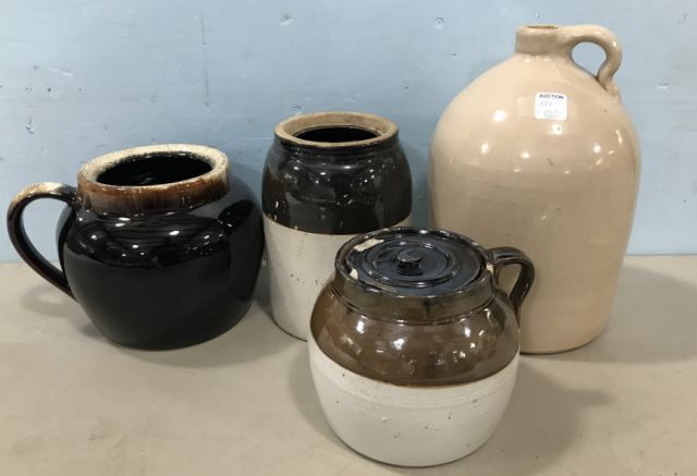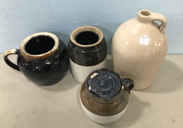 Glaze ceramic jug, two crock pottery pieces, and stoneware whiskey jug 12"h. Glaze ceramic jug, two crock pottery pieces, and stoneware whiskey jug 12"h.