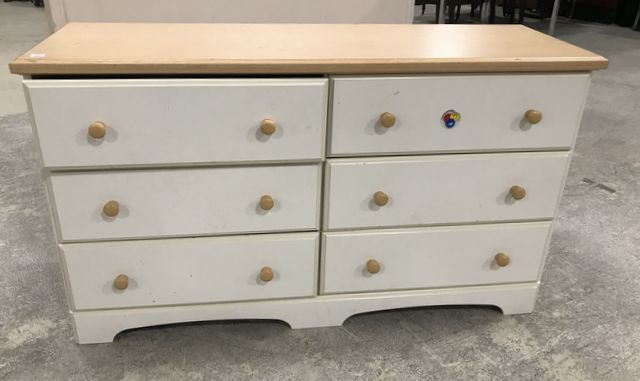 Modern Pressed Board Dresser Kit, double dresser, six drawers, needs work, white base with wood color top, 29"h., 49"w., 16"d. Modern Pressed Board Dresser Kit, double dresser, six drawers, needs work, white base with wood color top, 29"h., 49"w., 16"d.
