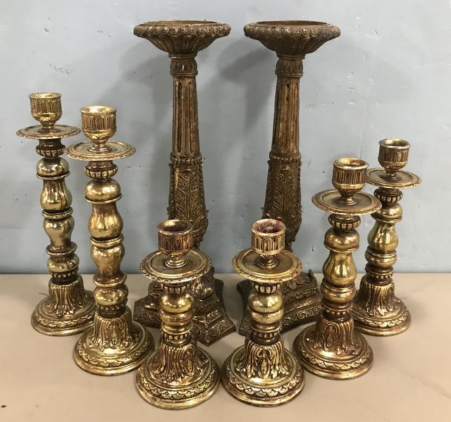 Group of Decorative Candle Stick Holders, 8 total gold gilt style candle holders, tallest are 16"h. Group of Decorative Candle Stick Holders, 8 total gold gilt style candle holders, tallest are 16"h.