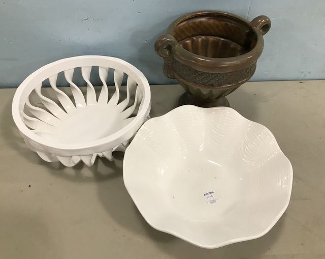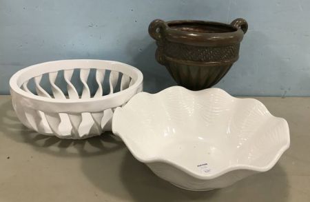 Ceramic Painted Urn and Milk Glass Bowls, scalloped edge bowl, and unique bowl. Ceramic Painted Urn and Milk Glass Bowls, scalloped edge bowl, and unique bowl.