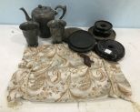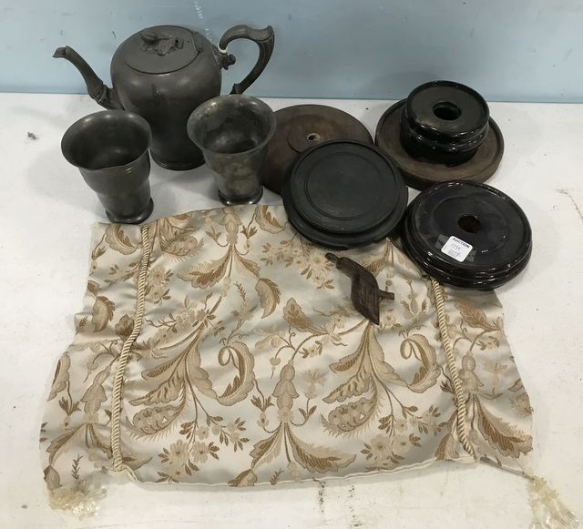 Metal pitcher, two cups, five vase stands, small tapestry decor. Metal pitcher, two cups, five vase stands, small tapestry decor.