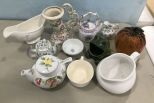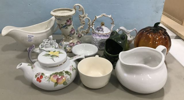 Art glass apple decor, pottery frog, stoneware pitcher, gravy boat, hand painted porcelain vases, pitchers, cup, dish. Art glass apple decor, pottery frog, stoneware pitcher, gravy boat, hand painted porcelain vases, pitchers, cup, dish.