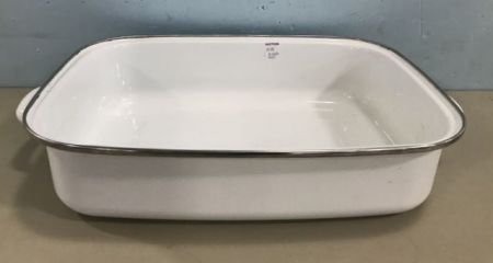 Enamel ware cooking pan, handled, white, 4"h., 17"w. Enamel ware cooking pan, handled, white, 4"h., 17"w.
