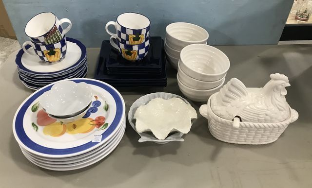 Assorted Group of Stoneware Everyday Plates and Bowls, rooster tureen, 6 bowls, dishes, four cups, blue square plates, round plates. Assorted Group of Stoneware Everyday Plates and Bowls, rooster tureen, 6 bowls, dishes, four cups, blue square plates, round plates.
