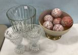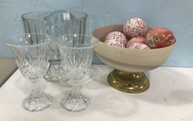 Clear glass planter center piece, two glasses, and decoration center piece bowl compote with porcelain balls. Clear glass planter center piece, two glasses, and decoration center piece bowl compote with porcelain balls.