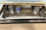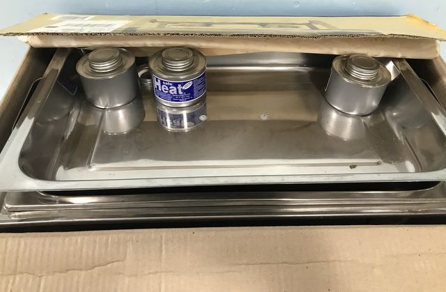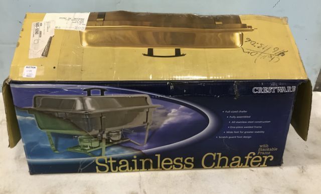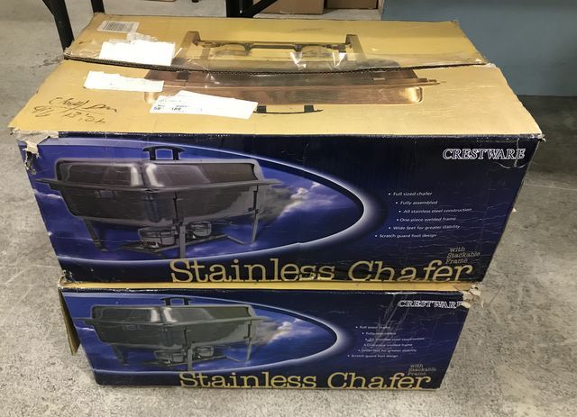 Three boxes of stainless chafer dishes, in box, used, with stackable frame, by Crestware. Three boxes of stainless chafer dishes, in box, used, with stackable frame, by Crestware.