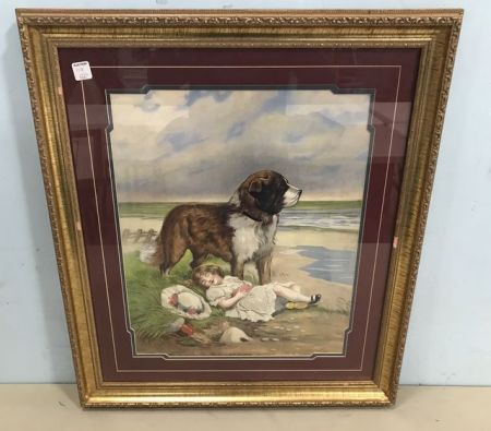 "On Guard" Dog with little girl, gold gilt framed, matted, 28"h., 24"w. "On Guard" Dog with little girl, gold gilt framed, matted, 28"h., 24"w.