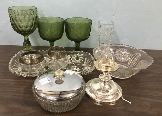 Green tall goblets 8"h., pressed glass dish, bowl, glass flute vase, silver plate rim creamer and sugar, candy dish, candle holder. Green tall goblets 8"h., pressed glass dish, bowl, glass flute vase, silver plate rim creamer and sugar, candy dish, candle holder.
