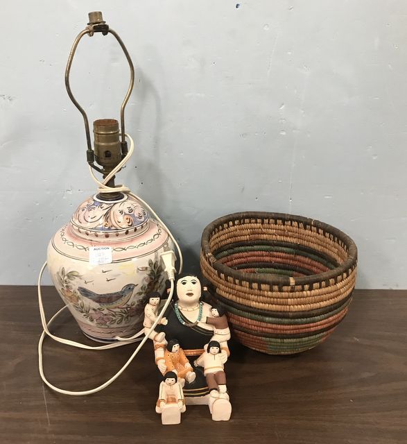 1325 Asian Figurine, Hand Painted Table Lamp, and Woven Basket