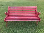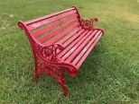 Painted red wood and metal outdoor bench, ornate metal sides, wood seats, fairly sturdy, does have some paint chipping. Painted red wood and metal outdoor bench, ornate metal sides, wood seats, fairly sturdy, does have some paint chipping.