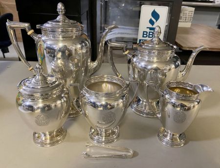 Reed & Barton Sterling Service, coffee pitcher, tea/water pitcher, sugar, creamer, waste, monogrammed, marks are bird, R, lion, x610 sterling, tea/water pitcher is missing pin for lid, waste has a small dent, good condition. Also Includes some small sterling tongs. 72.61 ozt. Reed & Barton Sterling Service, coffee pitcher, tea/water pitcher, sugar, creamer, waste, monogrammed, marks are bird, R, lion, x610 sterling, tea/water pitcher is missing pin for lid, waste has a small dent, good condition. Also Includes some small sterling tongs. 72.61 ozt.