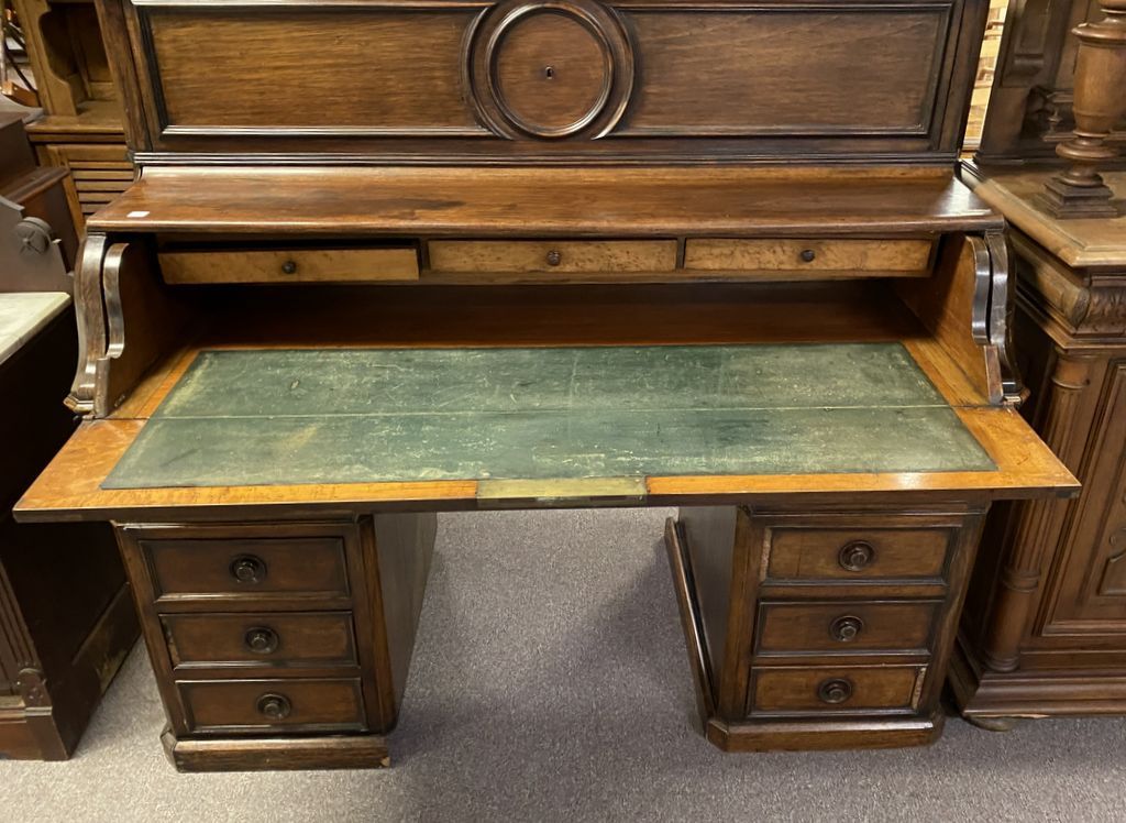 Antique Mahogany Secretary Desk, pedestal bases with drawers, 5 pieces, missing side trim, needs functional work, front gets stuck, can be adjusted, 52"h., 56"w., 26"h., Antique Mahogany Secretary Desk, pedestal bases with drawers, 5 pieces, missing side trim, needs functional work, front gets stuck, can be adjusted, 52"h., 56"w., 26"h.,