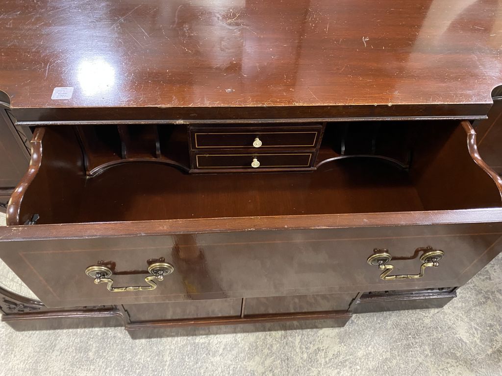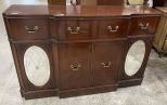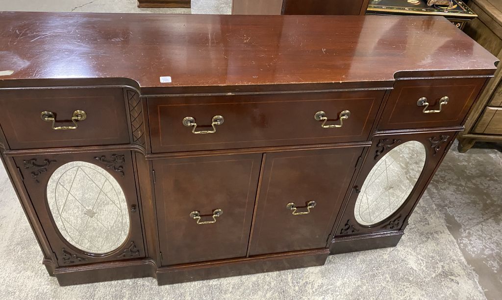 Antique Reproduction Wall Console Cabinet, front drawer des, doors, two with oval mirror, light scuffs, scratches, 36"h., 58"w., 16"d Antique Reproduction Wall Console Cabinet, front drawer des, doors, two with oval mirror, light scuffs, scratches, 36"h., 58"w., 16"d
