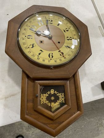 Hamilton 31 Day Wall Clock, octagon, glass face, has key and pendulum, 24"h. untested. Hamilton 31 Day Wall Clock, octagon, glass face, has key and pendulum, 24"h. untested.