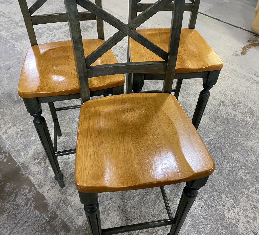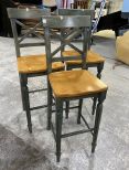 Three Distressed Painted Bar Stools, wood seat, 47"h., 29" seat to ground. Three Distressed Painted Bar Stools, wood seat, 47"h., 29" seat to ground.