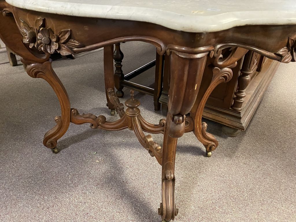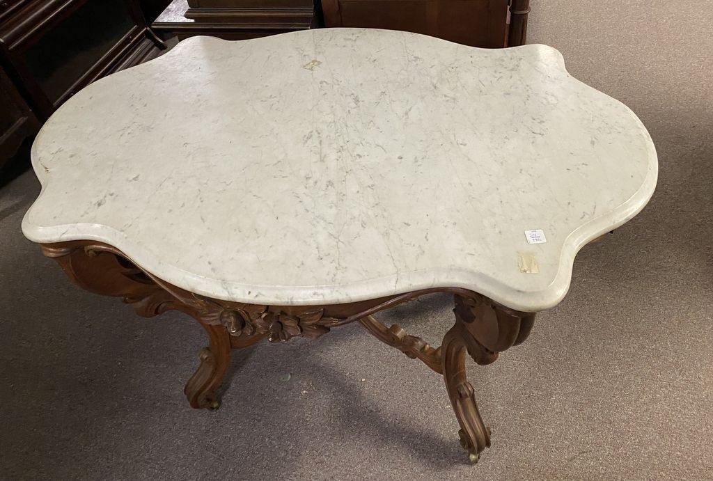 Antique Victorian Style Turtle Top Parlor Table , on casters, walnut, white marble top, 30"h., 45"w. Antique Victorian Style Turtle Top Parlor Table , on casters, walnut, white marble top, 30"h., 45"w.
