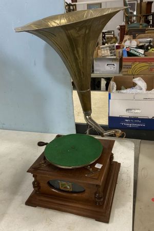 Vintage Gramophone Record Player, with horn, missing needle rod, mahogany case, 28"h., 12"w. Vintage Gramophone Record Player, with horn, missing needle rod, mahogany case, 28"h., 12"w.