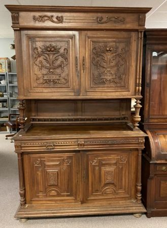 Antique Ornate English Hutch Cabinet, three piece, ornate carved, aged condition on finish, 91"h., 57"w., 21"d. Antique Ornate English Hutch Cabinet, three piece, ornate carved, aged condition on finish, 91"h., 57"w., 21"d.