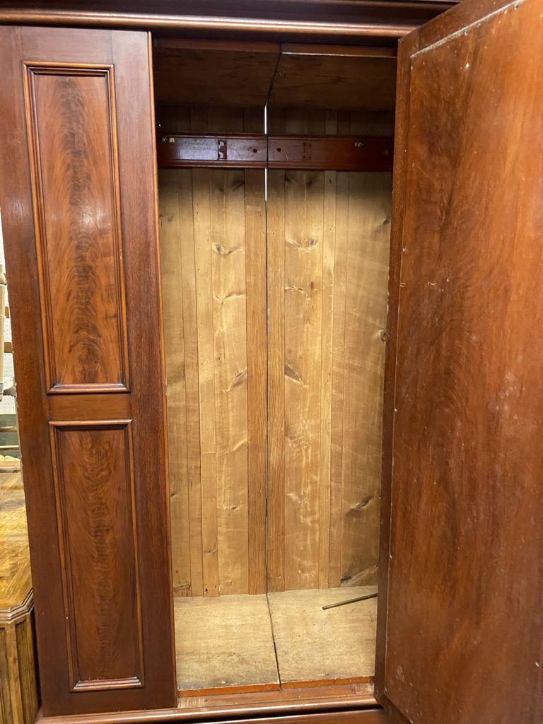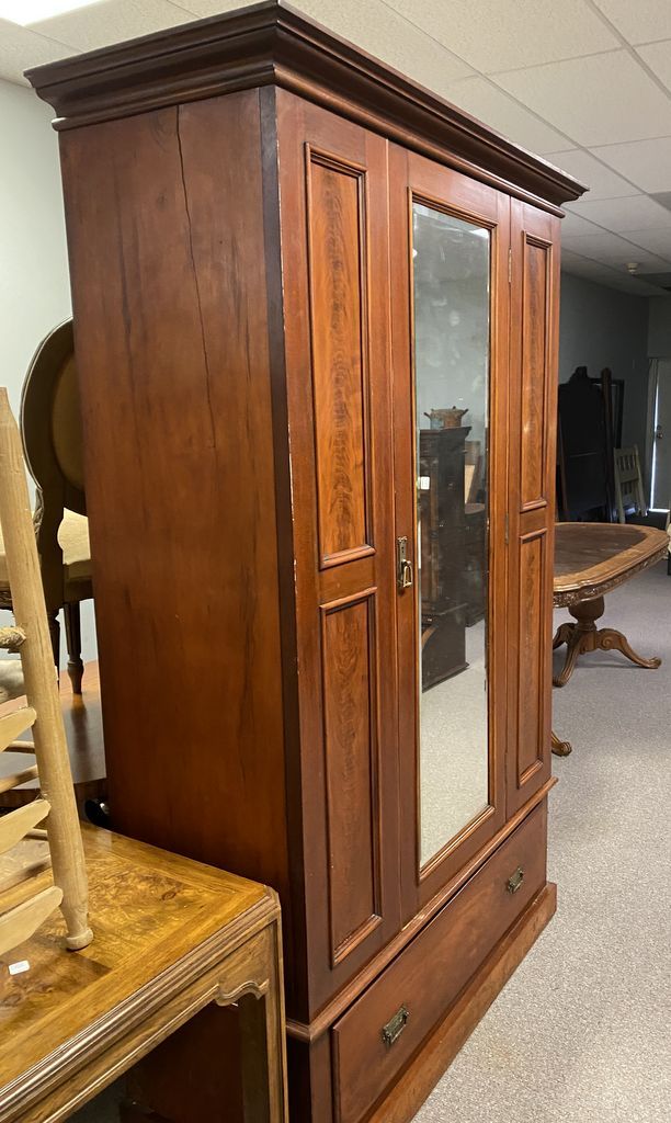 Large English Single Wardrobe, beveled mirror door, single drawer, burl finish, one piece, good condition, 85"h., 48"w., 18"d. Large English Single Wardrobe, beveled mirror door, single drawer, burl finish, one piece, good condition, 85"h., 48"w., 18"d.