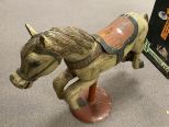 Antique Carousel Horse, hand carved, painted, has age wear, on metal stand, 36"h., 43"w. does have cracks. Antique Carousel Horse, hand carved, painted, has age wear, on metal stand, 36"h., 43"w. does have cracks.