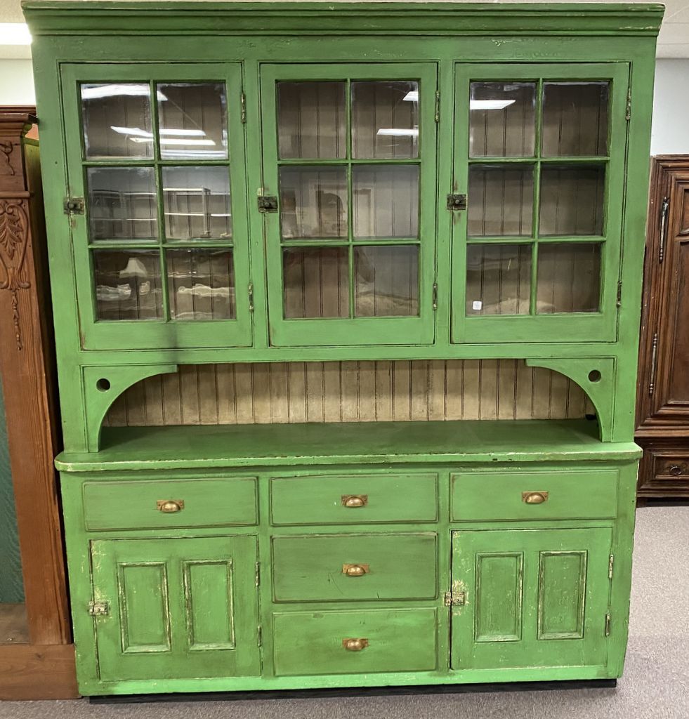 Large Primitive Painted Hutch, one piece, three glass doors, drawers, good condition, 86"h., 72"w., 17"d. Large Primitive Painted Hutch, one piece, three glass doors, drawers, good condition, 86"h., 72"w., 17"d.