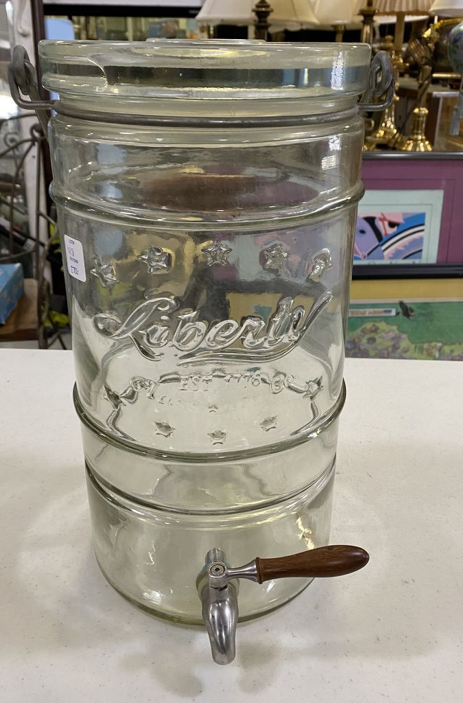 Liberty Glassware Co. Glass Dispenser, metal handled, 16"h. Liberty Glassware Co. Glass Dispenser, metal handled, 16"h.