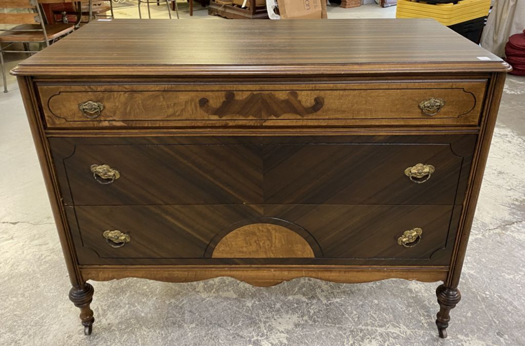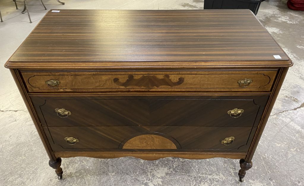 Depression Era Chest of Drawers, three drawers, Jacobean style, veneer walnut, on casters, good condition, 35"h., 46"w., 22"d. Depression Era Chest of Drawers, three drawers, Jacobean style, veneer walnut, on casters, good condition, 35"h., 46"w., 22"d.