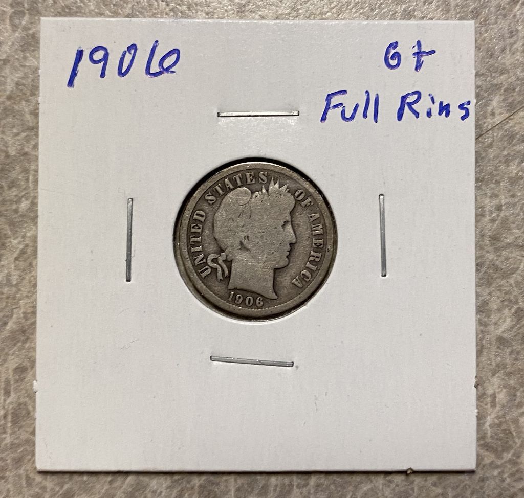 1906 Barber Dime, good plus, full rims, paper case. 1906 Barber Dime, good plus, full rims, paper case.