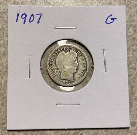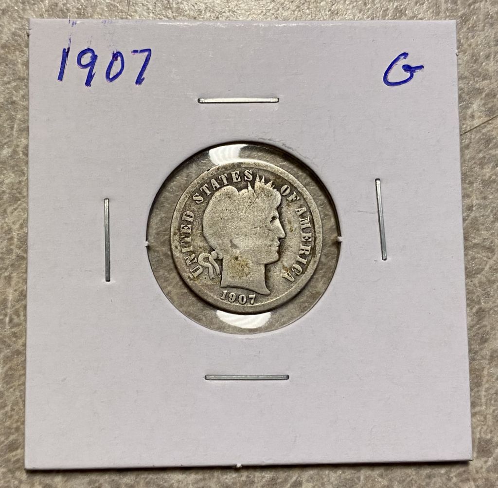 1907 Barber Dime, good plus, good condition, paper case. 1907 Barber Dime, good plus, good condition, paper case.