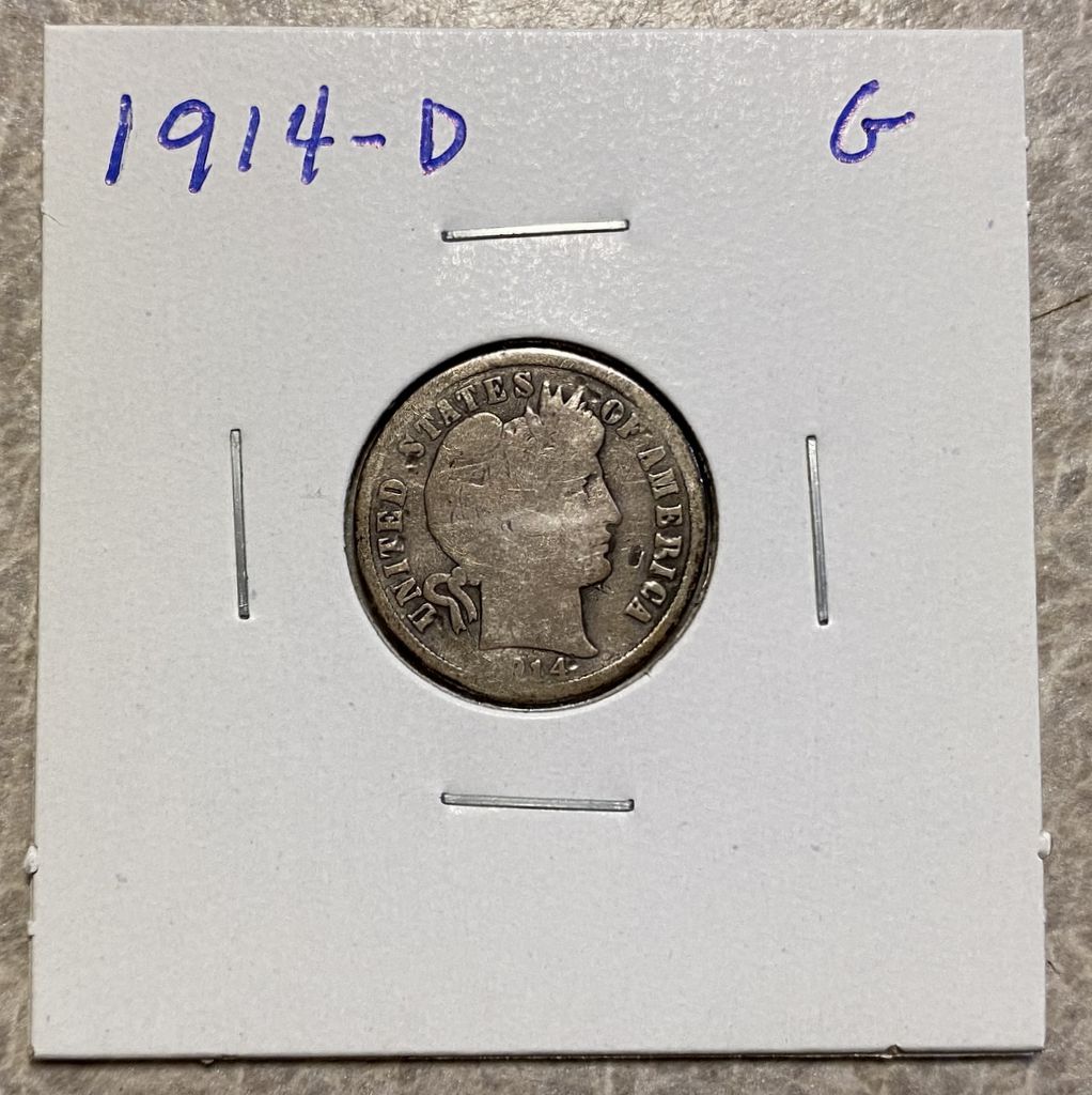 1914-D Barber Dime, good condition, paper case. 1914-D Barber Dime, good condition, paper case.